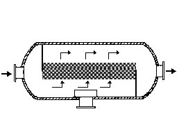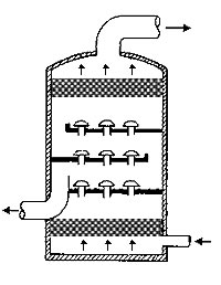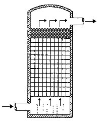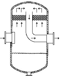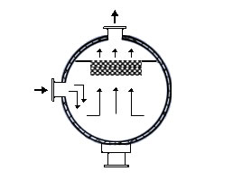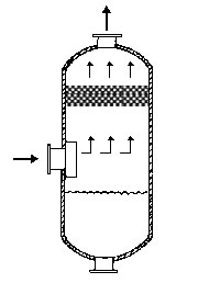 在通常的化工操作中所碰到的氣體中分散液滴的直徑約在0.1~5000μm。一般粒徑在100μm以上的顆粒因沉降速度較快,其分離問題很容易解決。通常直徑大于50μm的液滴,可用重力沉降法分離;5μm以上的液滴可用慣性碰撞及離心分離法;對(duì)于更小的細(xì)霧則要設(shè)法使其聚集形成較大顆粒,或用纖維過濾器及靜電除霧器。絲網(wǎng)除沫器,其主要用于分離直徑大于3μm~5μm的液滴,工作原理如右圖所示。當(dāng)帶有霧沫的氣體以一定的速度上升,通過架在格柵上的金屬絲網(wǎng)時(shí),由于霧沫上升的慣性作用,使得霧沫與細(xì)絲碰撞而粘附在細(xì)絲的表面上。細(xì)絲表面上的霧沫進(jìn)一步擴(kuò)散及霧沫本身的重力沉降,使霧沫形成較大的液滴沿著細(xì)絲流至它的交織處。由于細(xì)絲的可濕性、液體的表面張力及細(xì)絲的毛細(xì)管作用,使得液滴越來越大,直至其自身的重力超過氣體上升的浮力和液體表面張力的合力時(shí),就被分離而下落,流至容器的下游設(shè)備中。只要操作氣速等條件選擇得當(dāng),氣體通過絲網(wǎng)除沫器后,其除沫效率可達(dá)到97%以上,可以達(dá)到完全去除霧沫的目的。絲網(wǎng)除沫器(除霧器)用于分離塔中氣體夾帶的液滴,以保證有傳質(zhì)效率,降低有價(jià)值的物料損失和改善塔后壓縮機(jī)的操作,一般多在塔頂設(shè)置絲網(wǎng)除沫器。可有效去除3--5um的霧滴,塔盤間若設(shè)置除沫器,不僅可保證塔盤的傳質(zhì)效率,還可以減小板間距。所以絲網(wǎng)除沫器主要用于氣液分離。亦可為空氣過濾器用于氣體分離。此外,除沫器絲網(wǎng)還可作為儀表工業(yè)中各類儀表的緩沖器,以防止電波干擾的電子屏蔽器等。在化工工藝過程中,各種氣液相接觸設(shè)備的氣體離開設(shè)備時(shí)往往夾帶著不少液滴,如塔類設(shè)備、蒸發(fā)器等。一般要求把氣體中夾帶的液滴分離出來,以免影響氣體的品質(zhì)或下道工序的操作。從氣體分離液滴或霧沫的機(jī)理有重力下降、慣性碰撞、離心分離、布朗運(yùn)動(dòng)的擴(kuò)散沉積和靜電吸引。絲網(wǎng)除沫器是屬于慣性碰撞除沫中的典型產(chǎn)品,是一種高效的氣液分離設(shè)備。它具有除沫效率高、結(jié)構(gòu)簡(jiǎn)單、空隙率大、壓力降小、重量輕,安裝、操作、維修方便等特點(diǎn)。當(dāng)氣體自下而上通過絲網(wǎng)除沫器時(shí),由于慣性作用與絲網(wǎng)表面碰撞,霧沫隨即在細(xì)絲表面聚集而擴(kuò)張,不斷變大的液滴由于重量產(chǎn)生的重力超過氣速和液體表面的張力的合力時(shí),液滴就下落。工業(yè)上常用于塔器、蒸發(fā)器和分離器等。